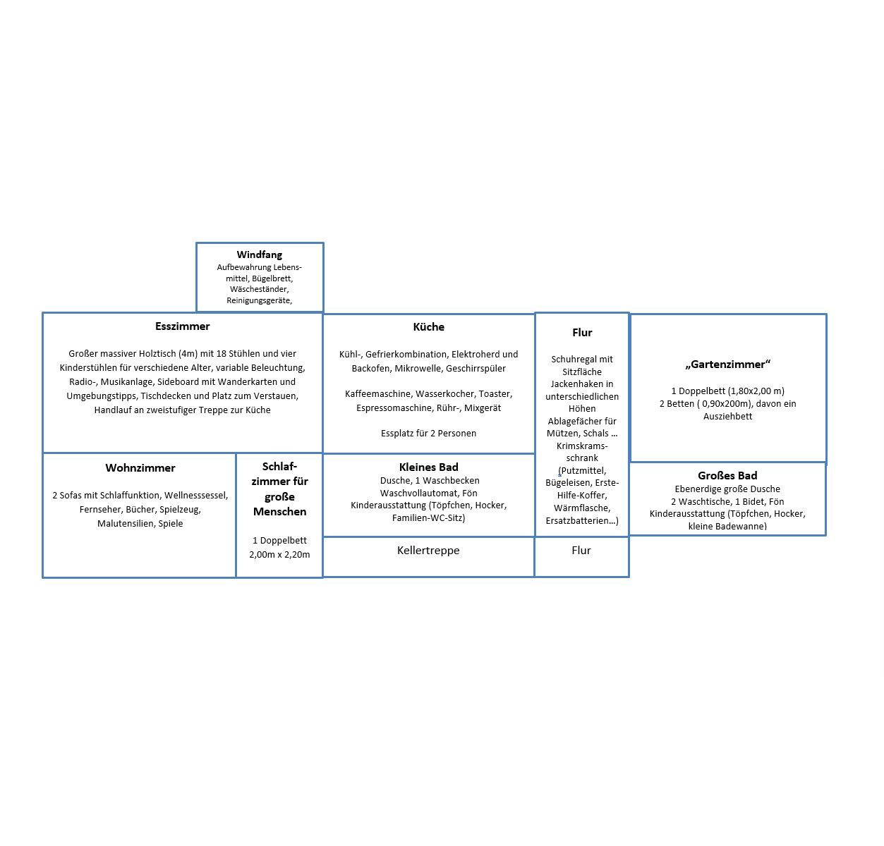 Eine Gruppe mit insgesamt 16 Kindern und Erwachsenen im Alter von 1-60 Jahren hat Haus und Garten für mehrere Tage getestet, 4 Mahlzeiten am Tag für alle zubereitet, Kuchen gebacken und darin nach einstimmiger Meinung alles gefunden was sie brauchten, außer Thermoskannen und einem Nudelholz. Das haben wir inzwischen ergänzt.