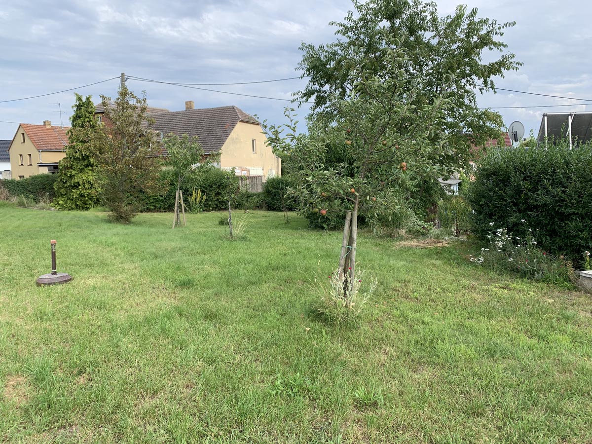- Mehrere Gartenbereiche mit viel Wiese, Blumenbeete, Obst- und Nadelbäume